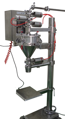 - Lúc này có thể tròng bao (thùng, ...) vào họng xả, nhấn nút mở van xả để xả hết chất lỏng (hoặc bột, hạt) khỏi phiễu cân. Đầu cân về 0 là kết thúc.